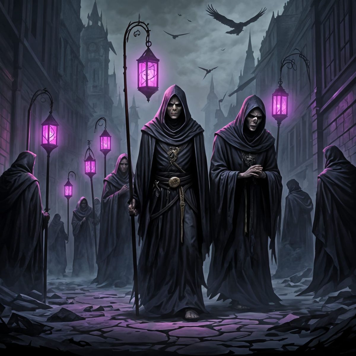 A haunting image of a procession of gaunt figures marching through a desolate, ash-covered city, illuminated by flickering violet lanterns and watched by spectral ravens.