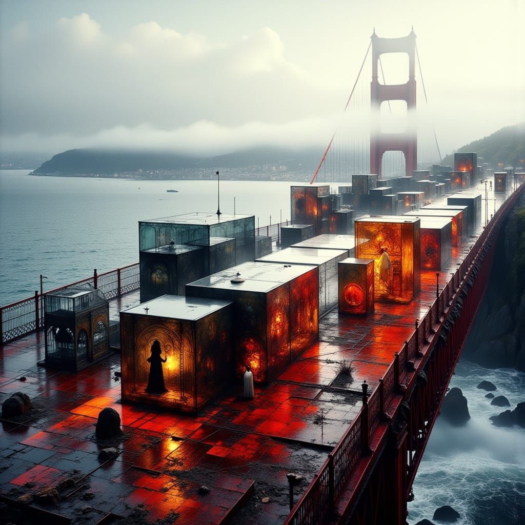 This image shows five glass cubes on the Golden Gate Bridge, displaying surreal images. The cubes feature black, red, and orange hues, reflecting the bridge and ocean in an otherworldly scene. The style is digital surrealism.