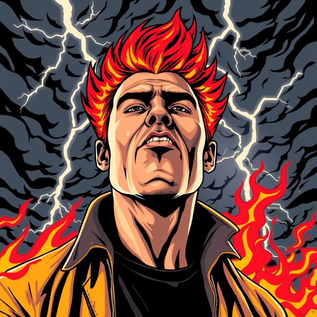This dynamic pop art portrait features a confident figure radiating intense heat and charisma, depicted with bold lines and electric colors against a dramatic, lightning-filled sky.