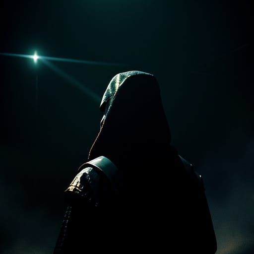 This image shows a cinematic film still with dramatic, atmospheric lighting. The scene is reminiscent of a live-action movie, enhanced with film grain and a vignette effect.