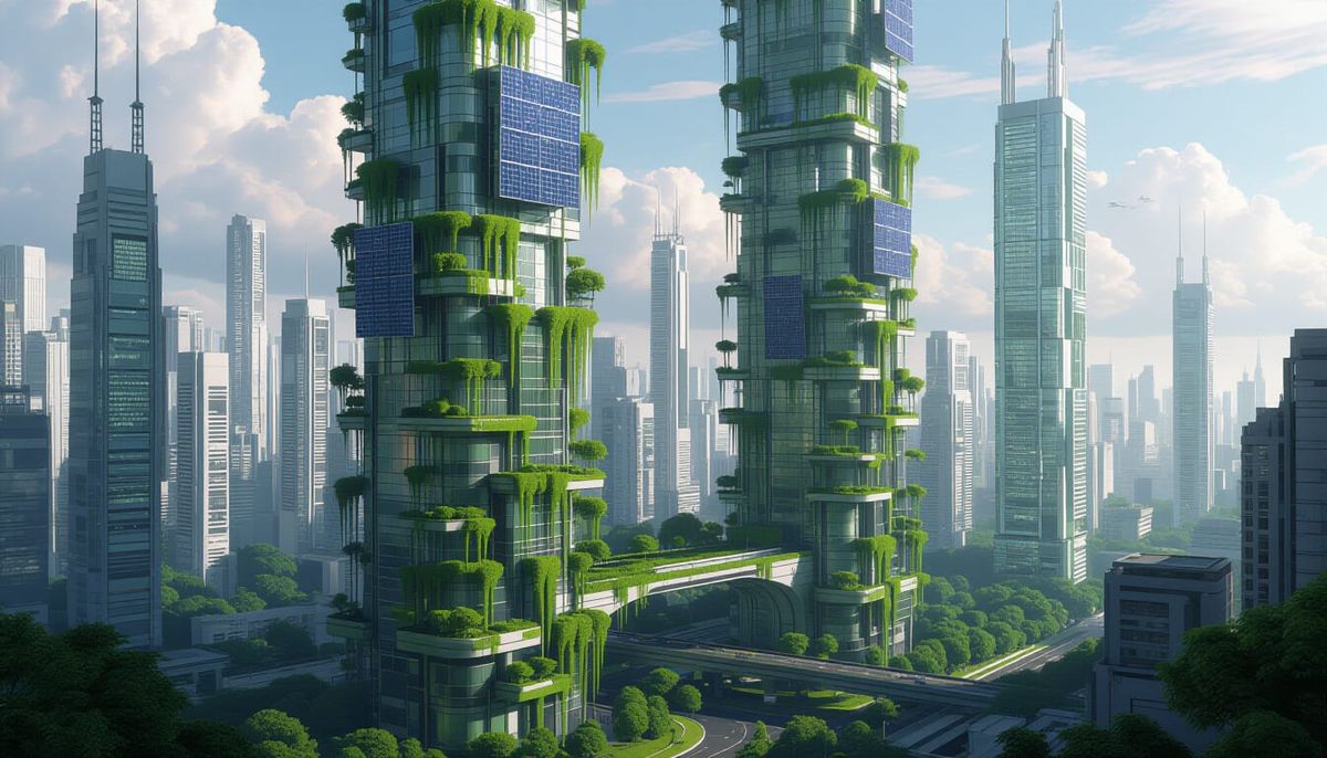 A hyper-realistic yet ethereal cityscape blending sleek skyscrapers with abundant vertical gardens and solar panels, evoking a surreal, advanced urban utopia.