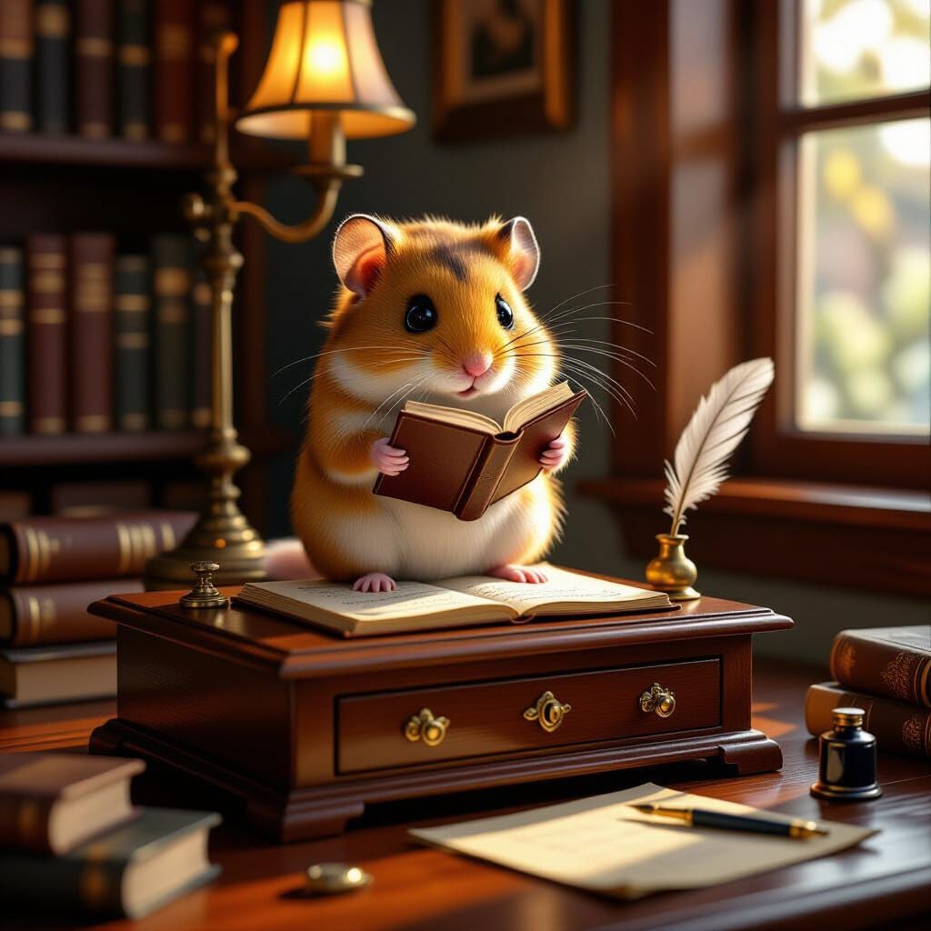 A whimsical children's book illustration featuring a small golden hamster perched atop an antique wooden writing desk. The hamster sits upright with tiny paws holding a miniature leather-bound book, its bright black eyes focused intently on the pages as if deeply absorbed in reading. The polished mahogany ...