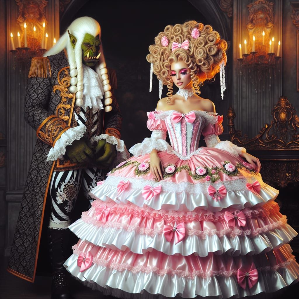 This image shows an orc king admiring a South Asian woman in a voluminous pink and white dress. The fantasy scene is set in gothic orcish architecture, with candlelight illuminating the subject.