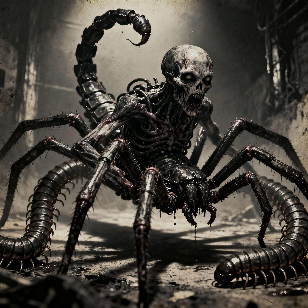 This image depicts a horrifying hybrid creature with spider, scorpion, and millipede features. It evokes a dark, vintage horror film aesthetic with dramatic lighting and heavy film grain.