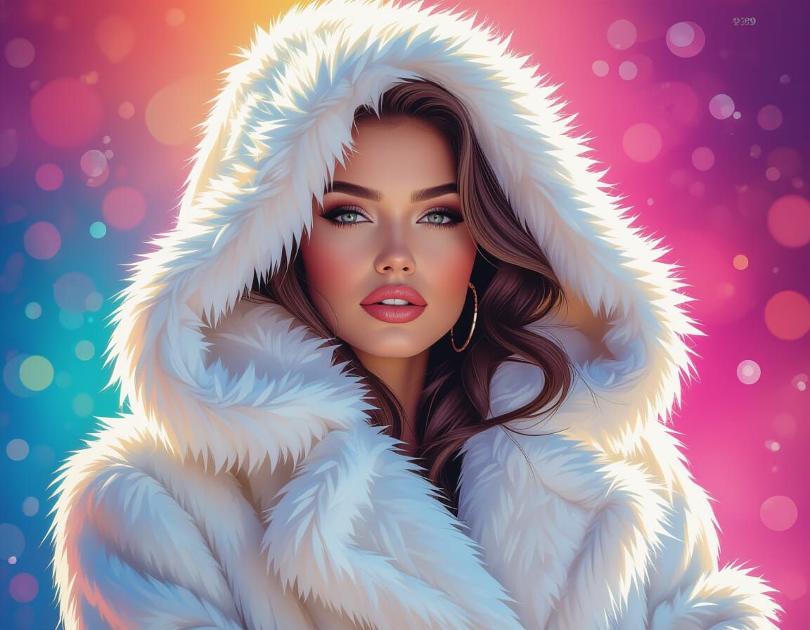 A vibrant pin-up style image of a woman in a fluffy white fur coat. Features bright colors and intricate details, reminiscent of diamond painting and splash art, with a bokeh effect.