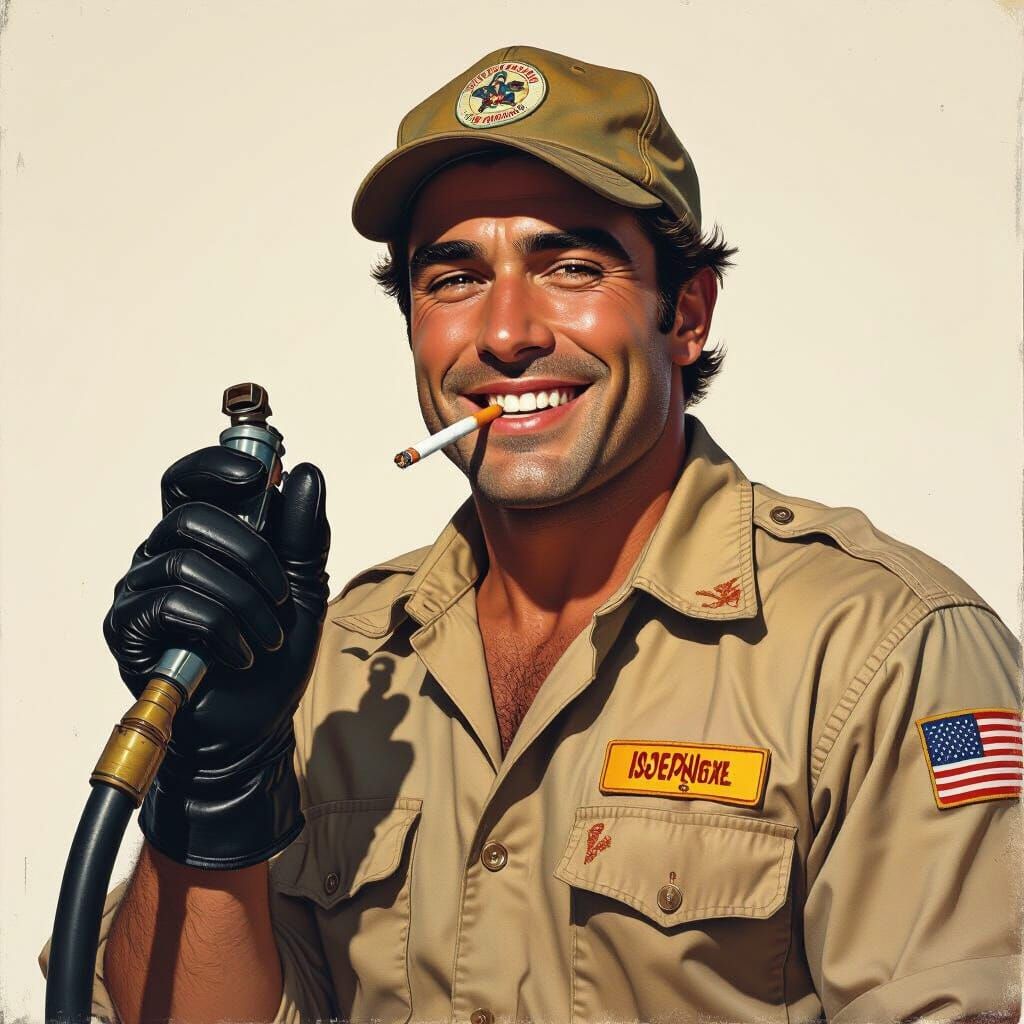 This image shows a retro-futuristic service station attendant with a sarcastic smile, cigarette dangling from his lips. His uniform is worn, and he's holding a gas hose, in a gritty aesthetic.