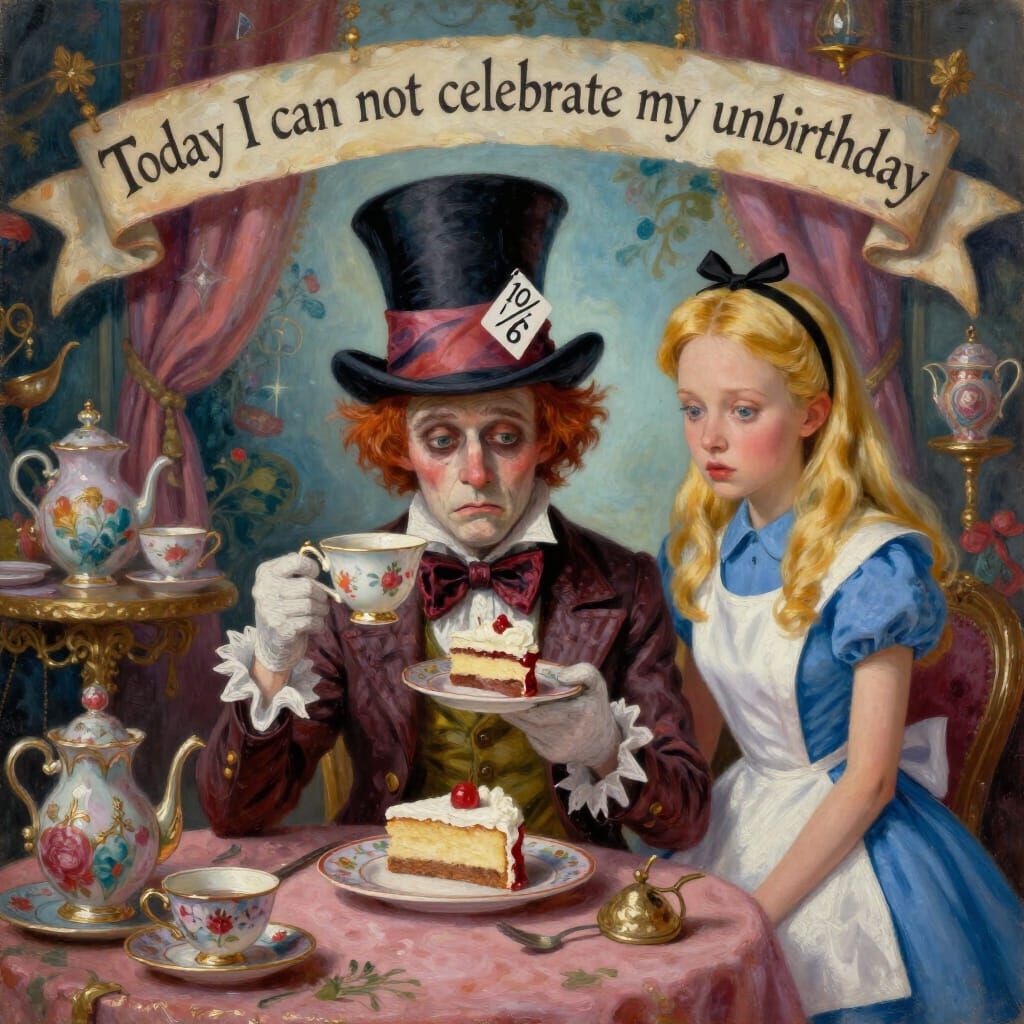 A vibrant oil painting captures the Mad Hatter and Alice in a surreal, dreamlike tea party scene. Featuring whimsical decor and a touch of melancholy lighting, this artwork evokes a fantastical atmosphere.