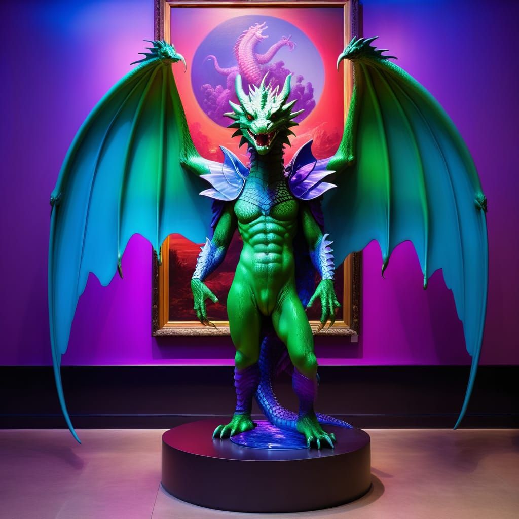 This oil painting captures a dragon in a green latex suit with large, veined wings, standing on a pedestal in a museum. The style evokes Rembrandt with a long exposure photography effect.