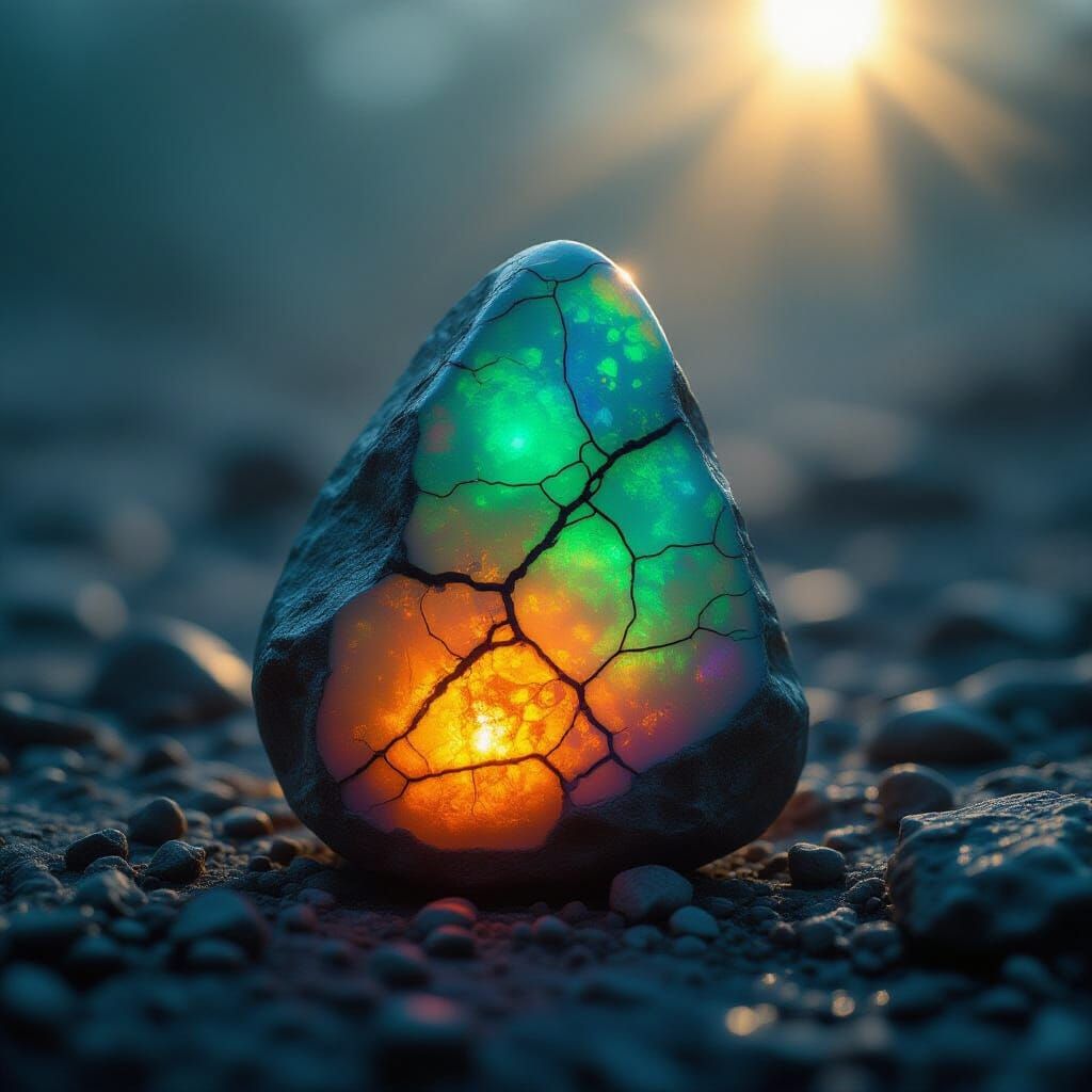 This image shows a luminous opal stone seemingly bleeding against a dark backdrop. The cinematic quality evokes dramatic lighting and texture as if captured on film.