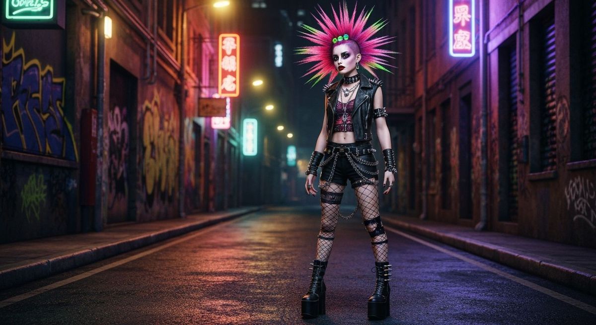 This image shows a punk gyaru girl in a dimly lit alleyway. She sports a bright pink mohawk, neon streaks, and avant-garde clothing, complete with ripped fishnets and platform boots, in a cyberpunk aesthetic.