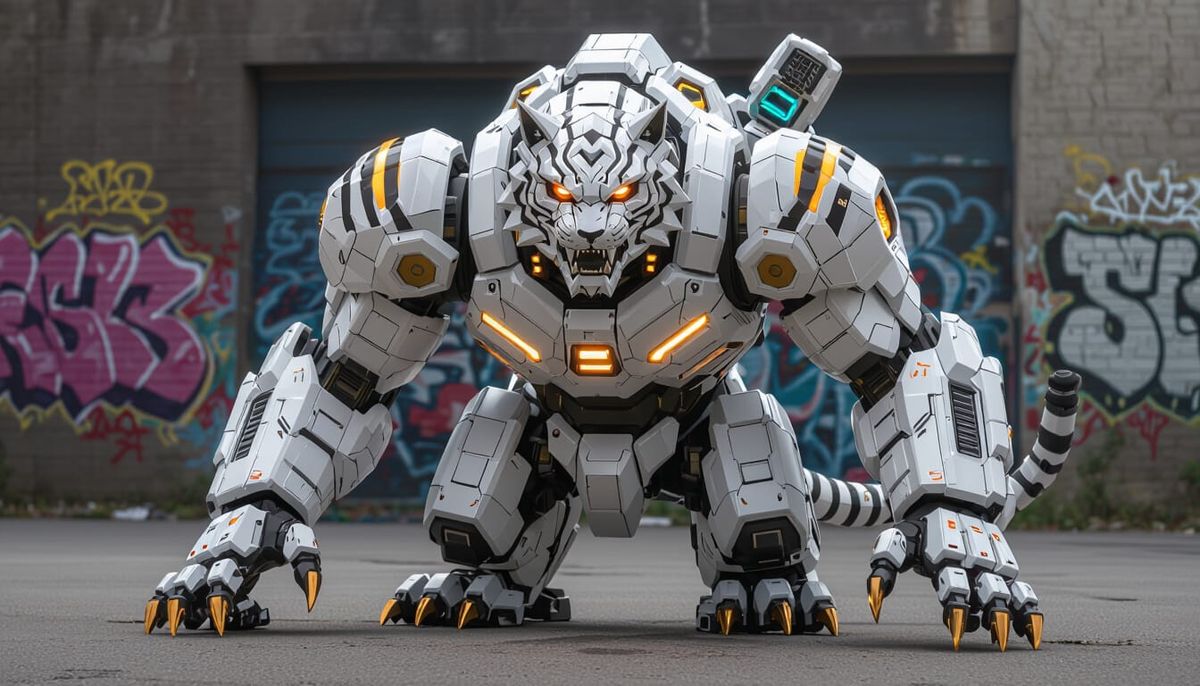 This image shows a powerful, robotic tiger mecha with white armor and glowing stripes. The design features hexagonal plates, a tiger skull head, and advanced weaponry, rendered in a futuristic, cinematic style.