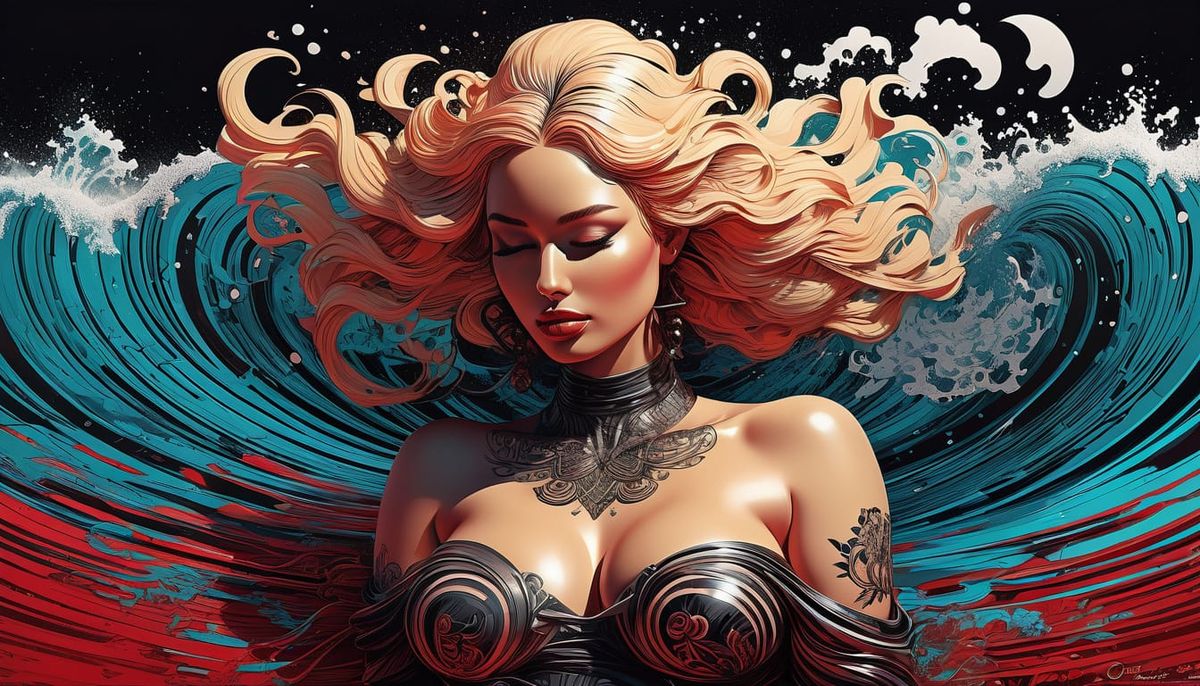 This image depicts a stunning, bioluminescent woman relaxing on a twilight beach, surrounded by intricate, colorful graffiti art and tattoos, showcasing a unique blend of styles and techniques.