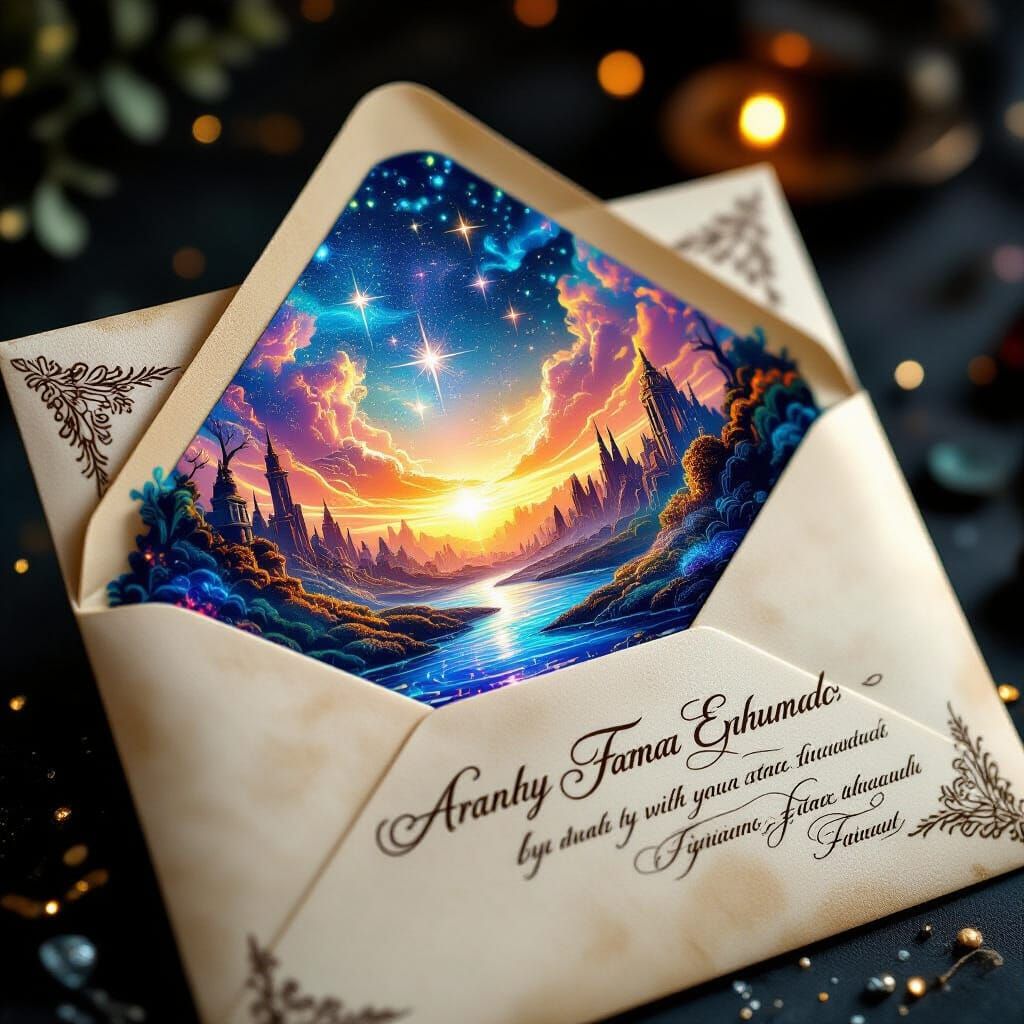 A macro view of an old envelope with glowing fantasy art emerging. Detailed matte painting style with sparkling, luminous colors and intricate design.