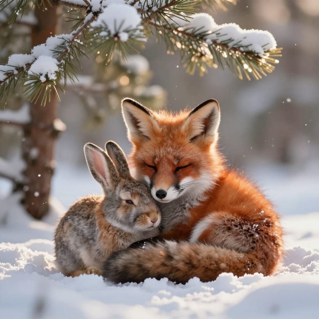 This heartwarming, photorealistic image shows a tiny fox cub and baby rabbit sleeping peacefully in the snow. Golden hour light creates a magical, cinematic forest scene.