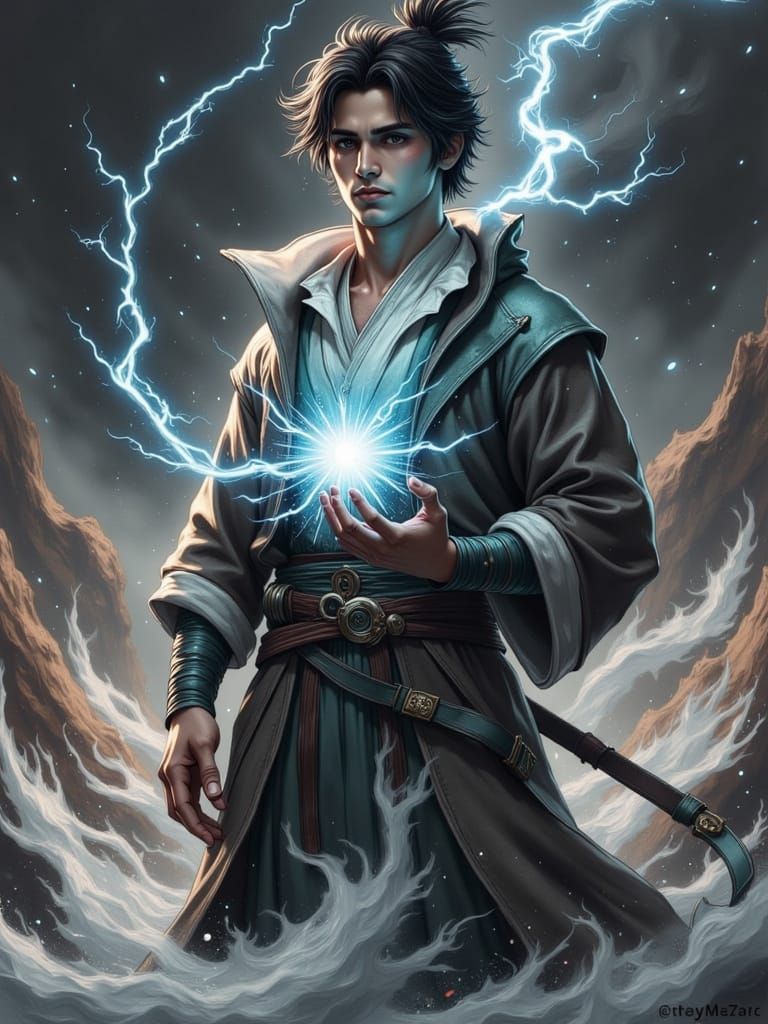 This image depicts a handsome young cultivator standing amidst a swirling storm, his face illuminated by lightning. The artwork combines traditional and digital elements, with bold brushstrokes and vibrant colors, evoking a cyberpunk aesthetic reminiscent of Feng Zhu and Loish.