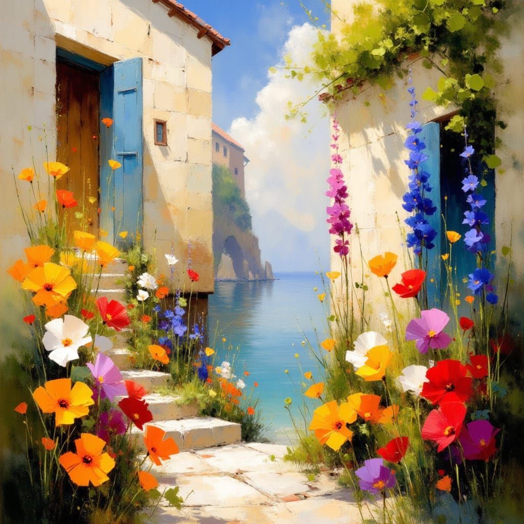 A beautiful Italian seaside village on a sunny day, captured in a highly realistic and detailed impressionistic art piece.