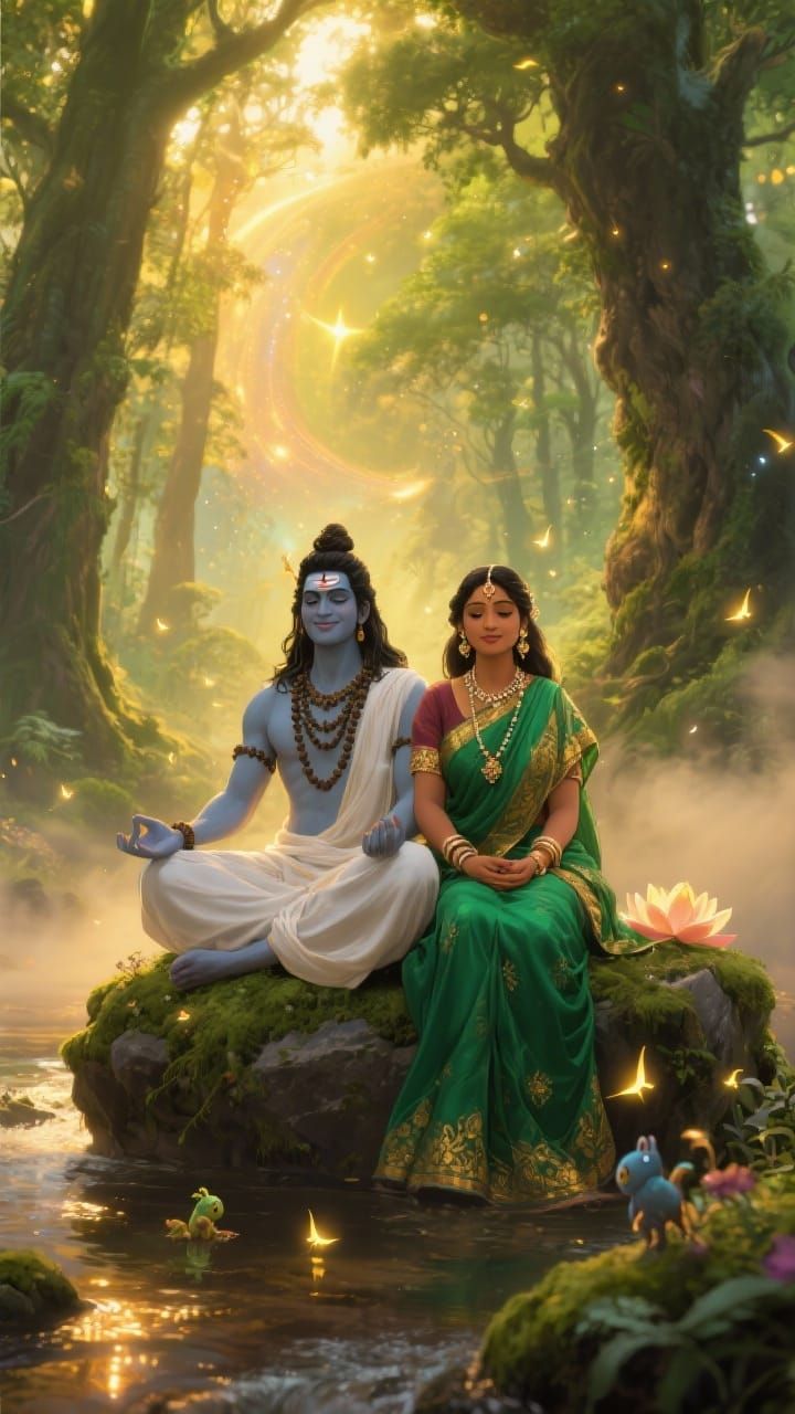 A striking picture of Shiva and Parvati in a serene forest. The digital illustration features a vibrant color palette, dappled sunlight, and mystical creatures to create a magical and cinematic atmosphere.