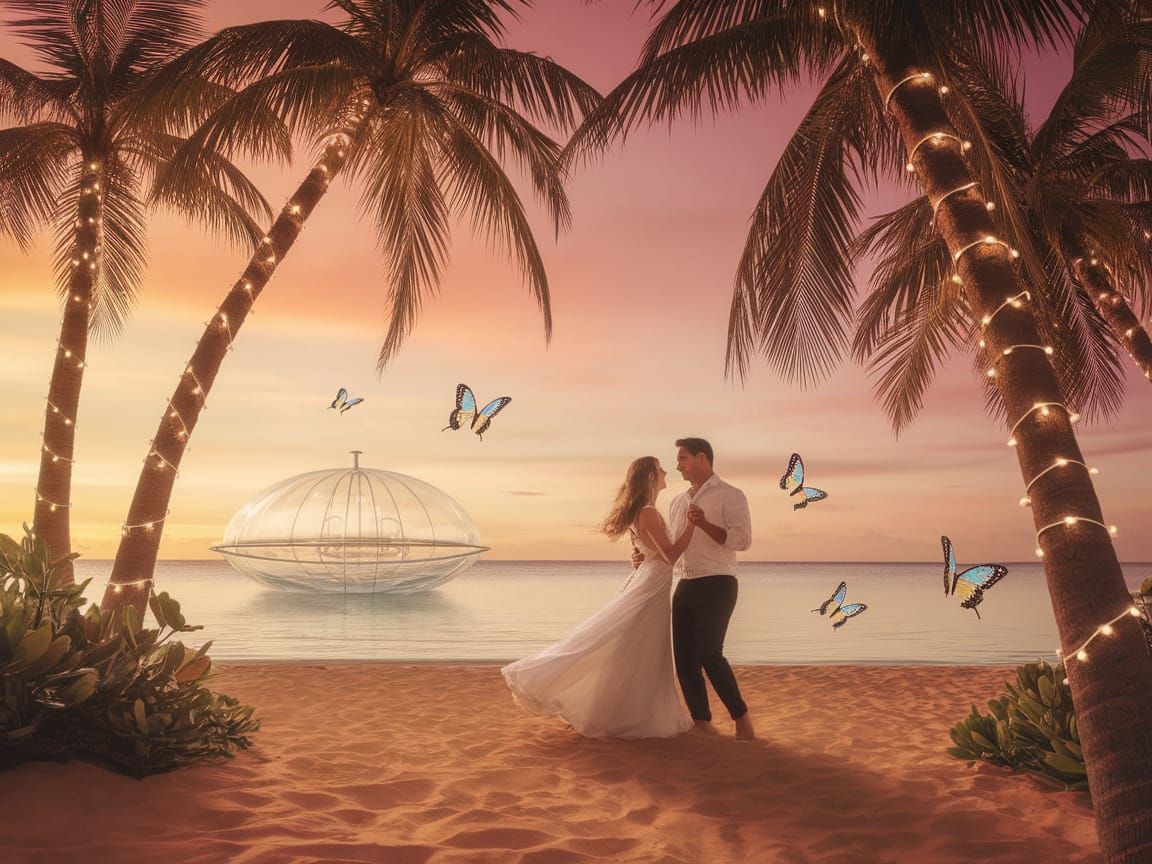 A warm, golden sunset bathes a sandy beach lined with swaying palm trees, where a couple dances gracefully under the soft glow of string lights intertwined between the fronds. In the distance, a transparent glass boat floats gently in a tranquil cove, its ethereal presence beckoning the lovers to embark ...