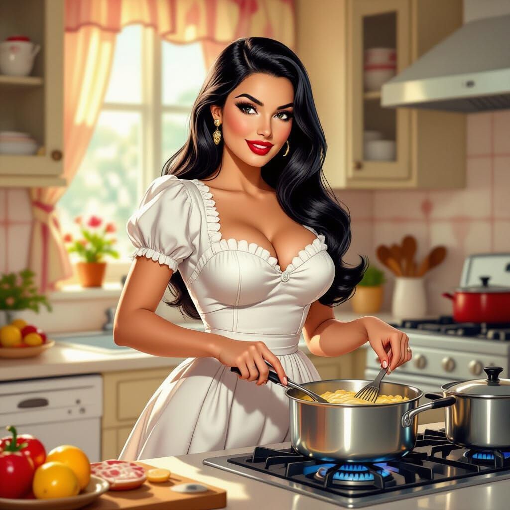 This image depicts a voluptuous Italian woman in a 1950s housewife dress, cooking in a vibrant, retro kitchen. It captures a playful pin-up aesthetic with warm lighting and bold colors.