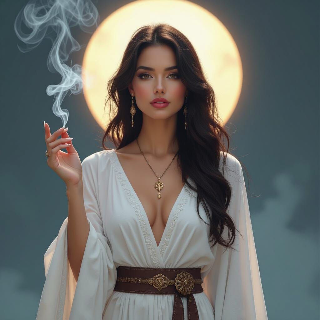 A striking picture of a female angel in a white robe, holding out a key. Smoke rises from below, set against a dark musical backdrop. The style incorporates fantasy and mystical elements.