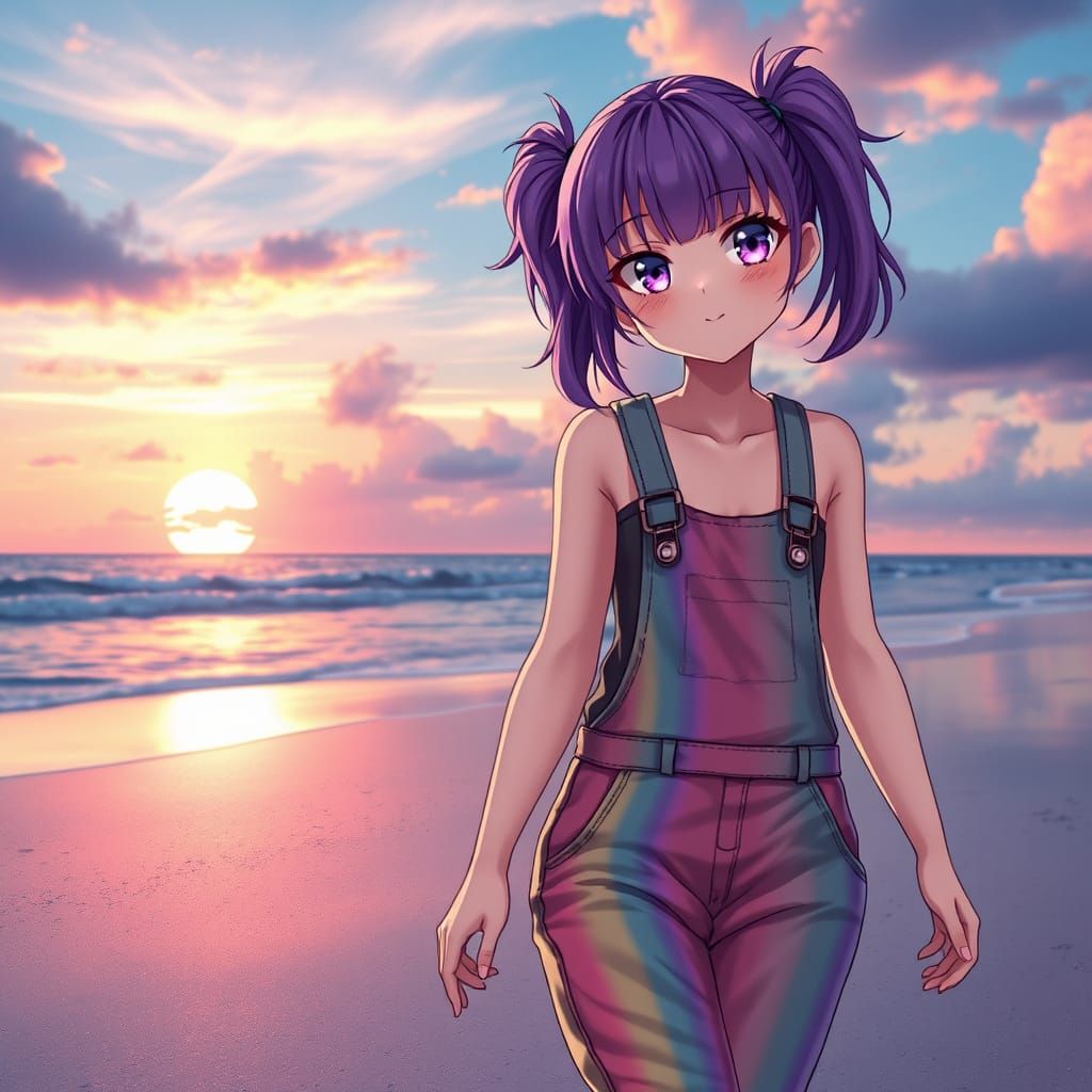 This image shows a girl with purple pigtails and eyes walking on a beach during sunset. The girl is wearing rainbow overalls in a stylized 3D anime aesthetic.