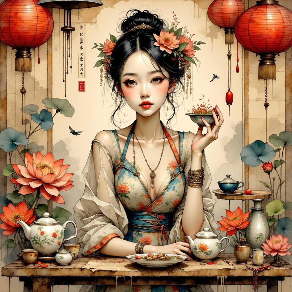 This image shows a serene Chinese tea ceremony with an elegant woman surrounded by porcelain teapots and calligraphy scrolls. Red lanterns and lotus flowers enhance the rich, detailed scene.