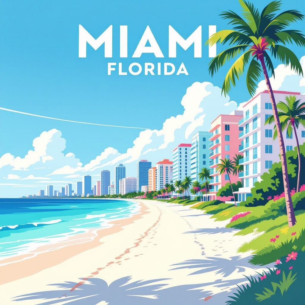 This image showcases a stylized graphic art depiction of Miami, Florida. It features a beach scene with modern buildings, palm trees, and tropical foliage, set against a dramatic sky.