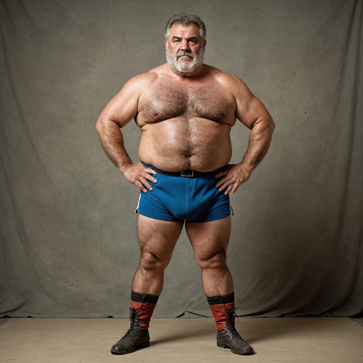 This image captures a confident wrestler proudly displaying his muscular physique and hairy chest, dressed in vibrant, multicolored trunks and boots.