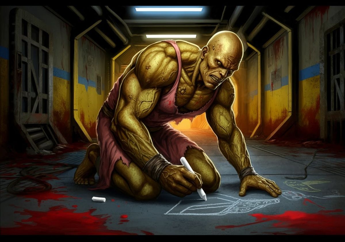 A comic book style drawing of a muscular, green-skinned super mutant in a tattered dress, kneeling in a bloody, abandoned underground hallway. The image features dark shadows and red emergency lighting.