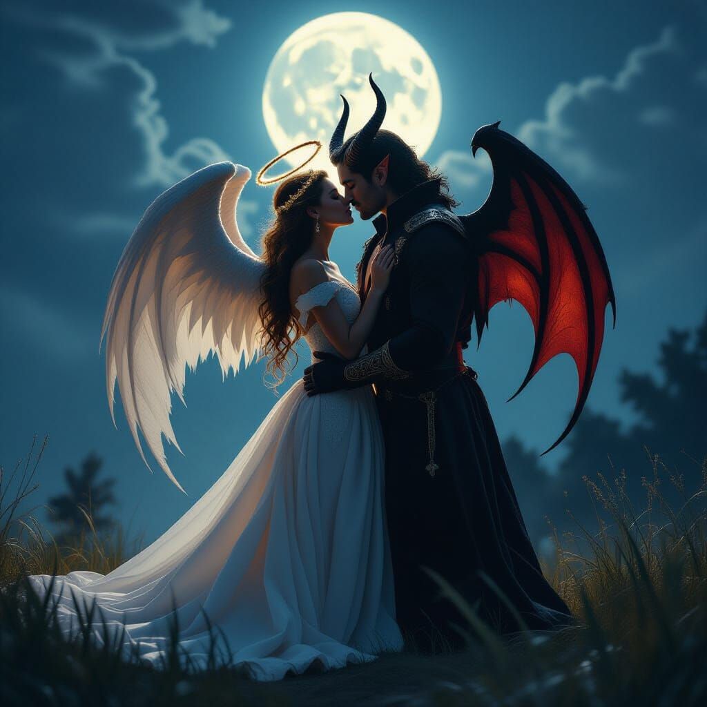This image shows an angel and a demon sharing a kiss beneath the moon, rendered with cinematic lighting and warm color grading. The scene evokes a live-action, atmospheric quality.