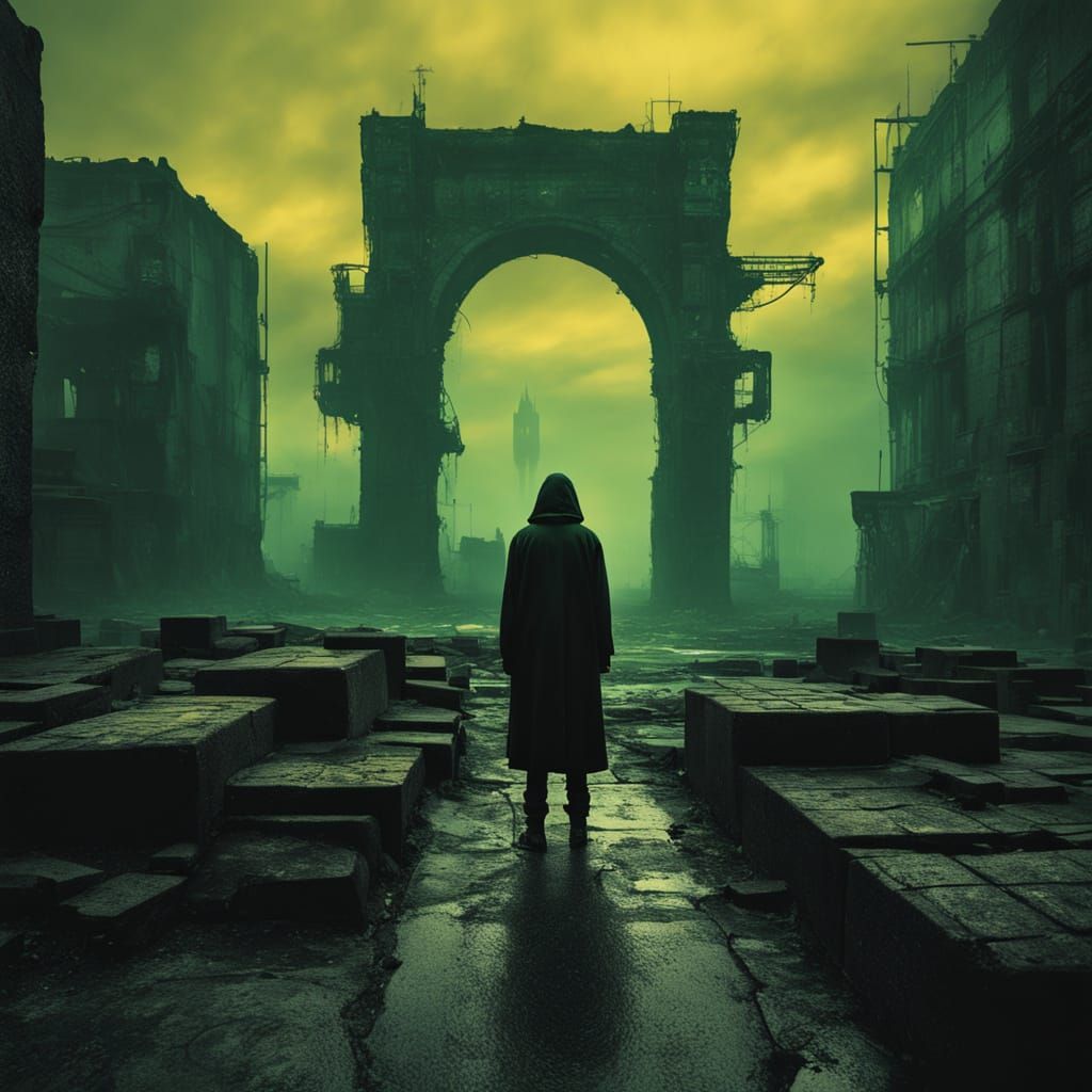 A striking image of a solitary goth fashion model in a ruined cyberpunk metropolis, bathed in neon glow and emerald fog. Cinematic and atmospheric.
