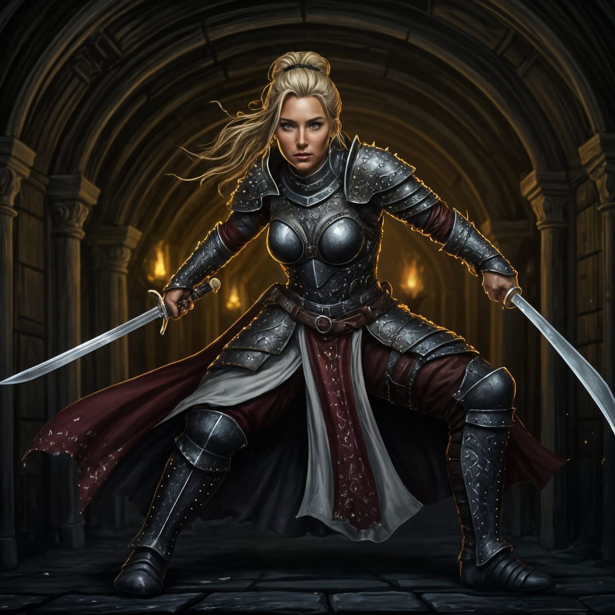 This image captures a powerful female cleric poised in a dramatic stance, reflecting both the ferocity of a warrior and the compassion of a healer. Set against the backdrop of a dimly lit culvert, she embodies divine power and cunning, her dark grey armor and piercing eyes exuding confidence and agility.