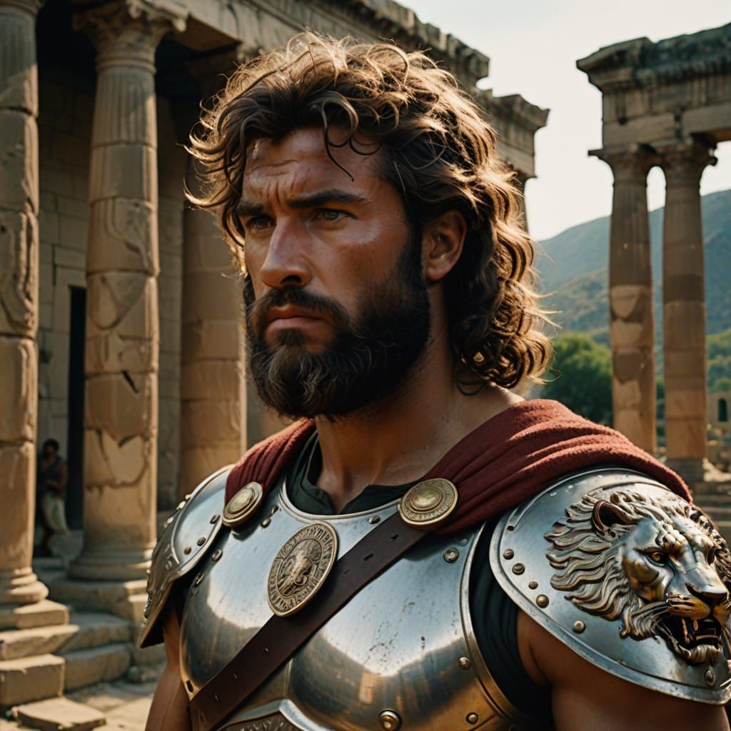 This image shows a muscular Hercules in ornate armor and a lion-skin cloak amidst majestic ancient ruins. Shot in a cinematic style with dramatic lighting and vivid colors.