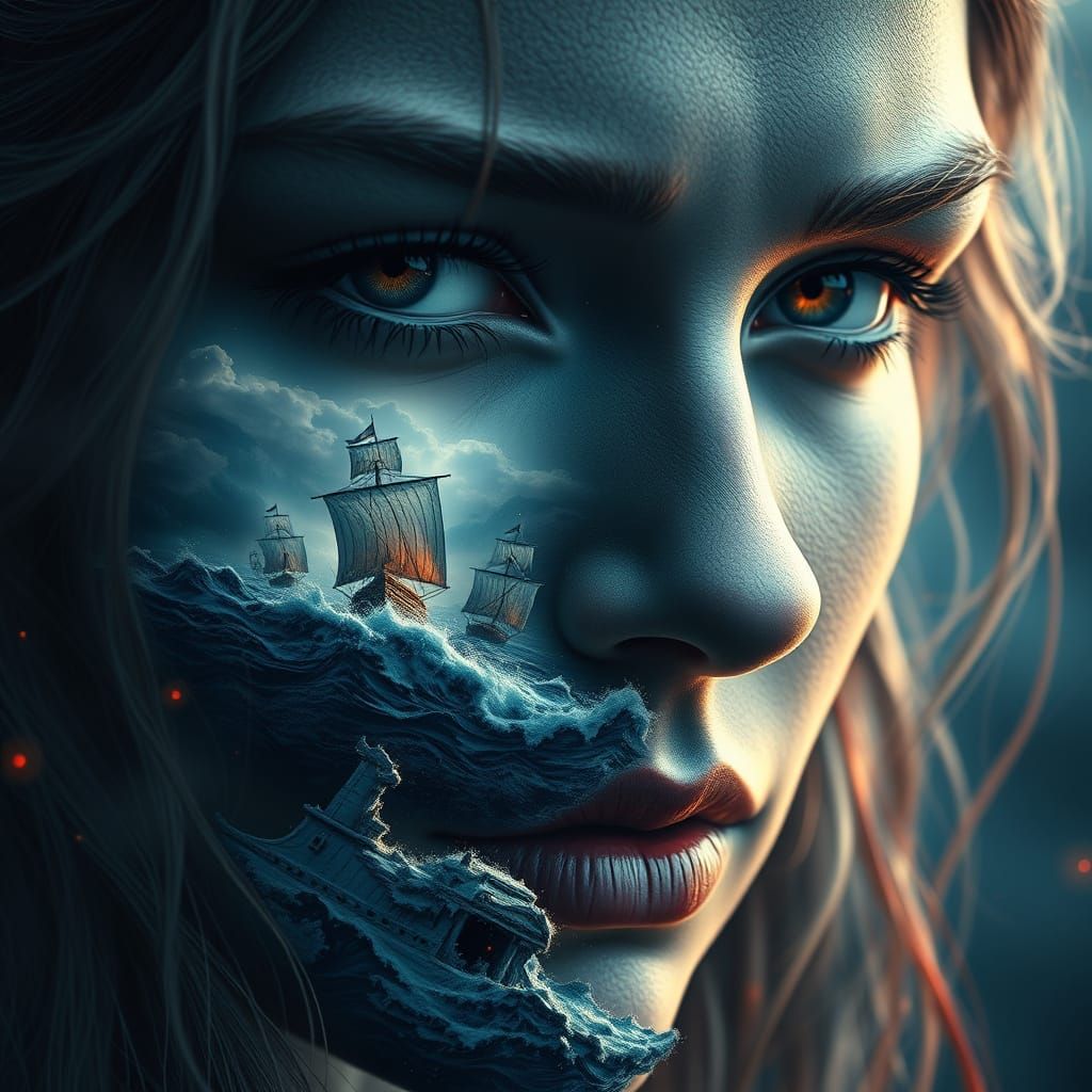 This hyperrealistic image features a Viking woman's face with a detailed landscape of Viking ships on a turbulent sea emerging from her features, in deep blues and greys with red accents.