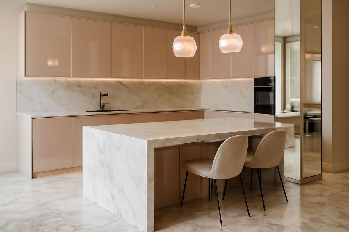 This image shows a modern kitchen with a glossy, powder-pink finish and marble accents. Mirrors adorn the supporting pillars, enhancing the natural lighting in a professional photograph.