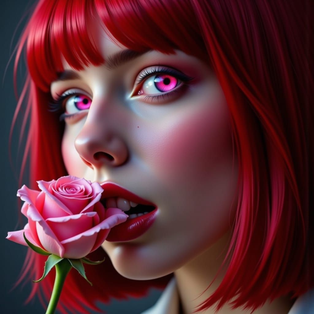 This image shows a hyperrealistic fantasy portrait of a woman with crimson hair, glowing pink eyes, and red lips. A pink rose is entwined around her mouth. Features cinematic lighting and intricate detail.