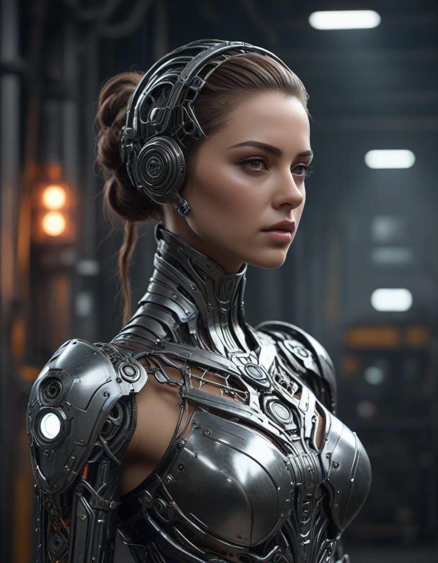 A photorealistic illustration of an android woman in a factory, featuring intricate biological and cybernetic augmentations. The image has a cool-toned palette and cinematic lighting.