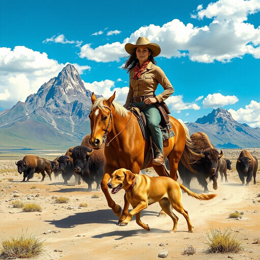 This image shows a woman in Western attire riding a horse, guiding bison across a dusty plain with mountains in the background. Rendered in a vibrant, realistic western art style.
