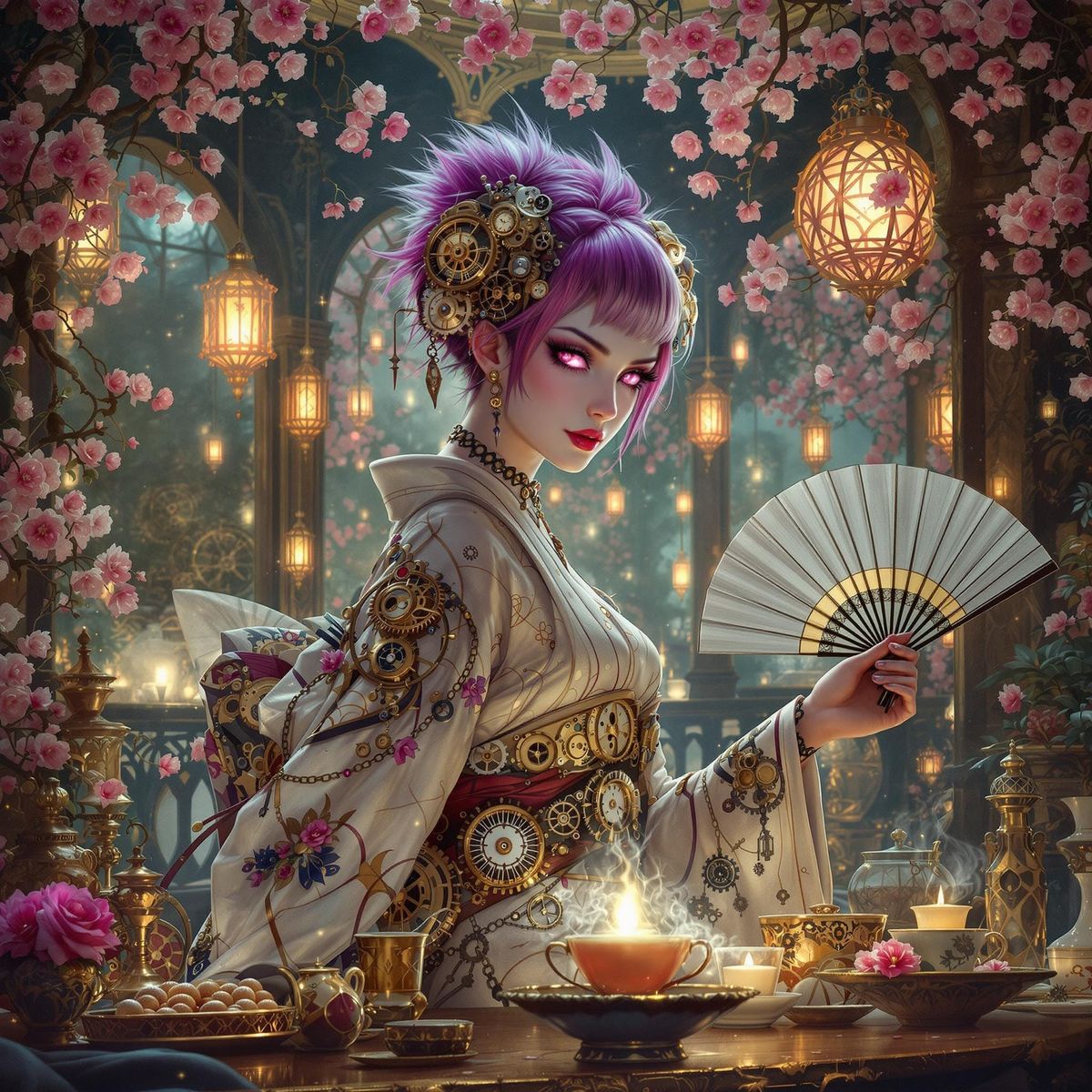 A steampunk geisha with neon hair and clockwork fans walks through a tea house. The image blends mystical realism and art nouveau elegance with steampunk fantasy elements, creating a unique aesthetic.