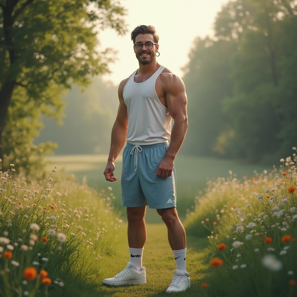 A photorealistic image of a confident, muscular man in a peaceful countryside. The natural light and soft tones create a romantic atmosphere, with realistic details in a painterly style.