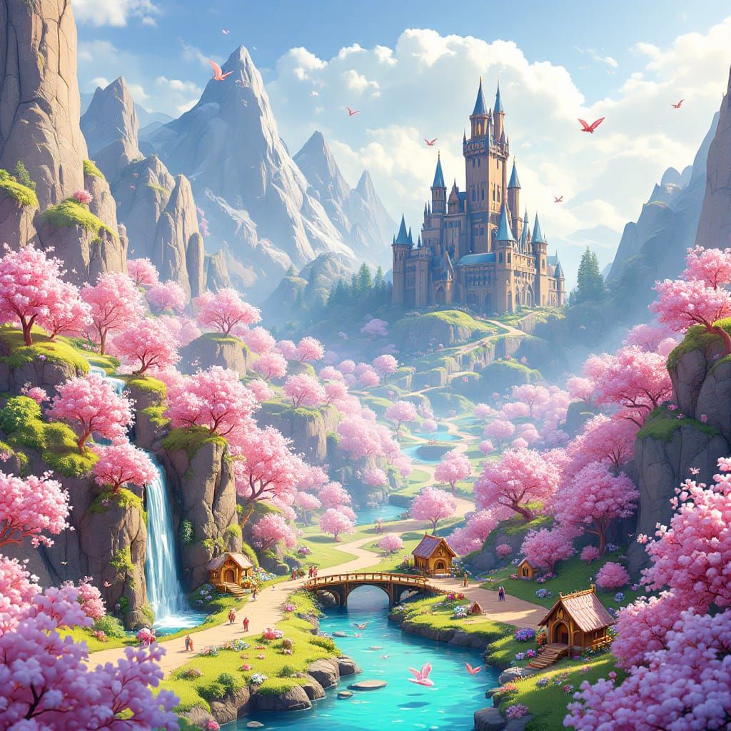 A hyperrealistic 3D anime landscape of a candy kingdom. Features gothic castles, lollipop trees, and cotton candy clouds under gentle sunlight. Inspired by fantasy concept art.