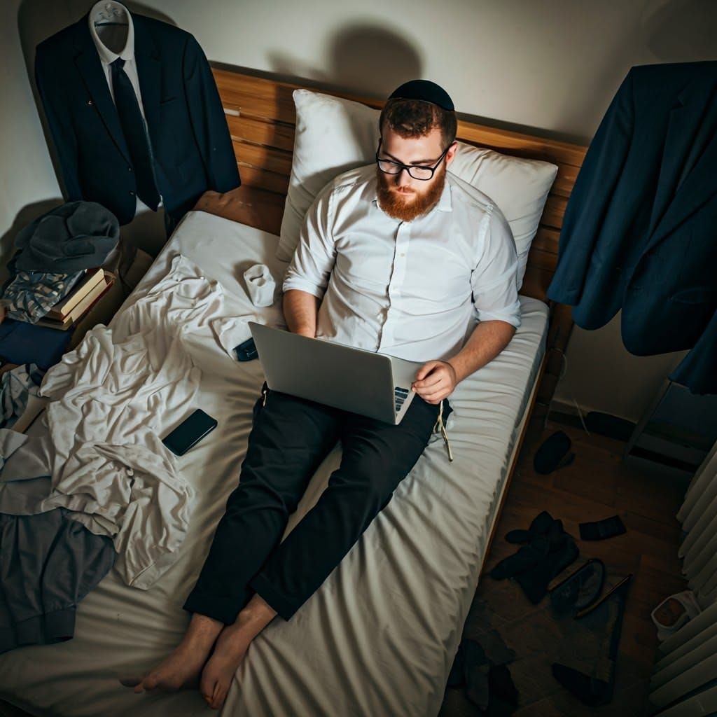 This image shows a young Haredi man lying on his bed, surrounded by chaos and disarray, as he struggles with depression and frustration. The dimly lit room reflects his emotional state, with clothes and books scattered everywhere.