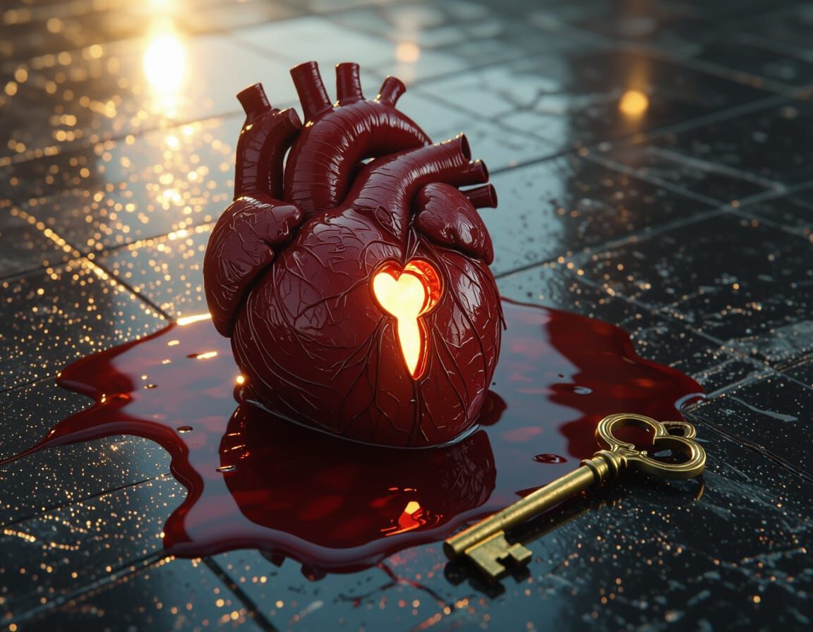 A hyper-realistic image of a bleeding heart with a glowing keyhole void on a dark floor, featuring glistening blood pools and a vintage key. Shot with cinematic lighting and shallow depth of field.