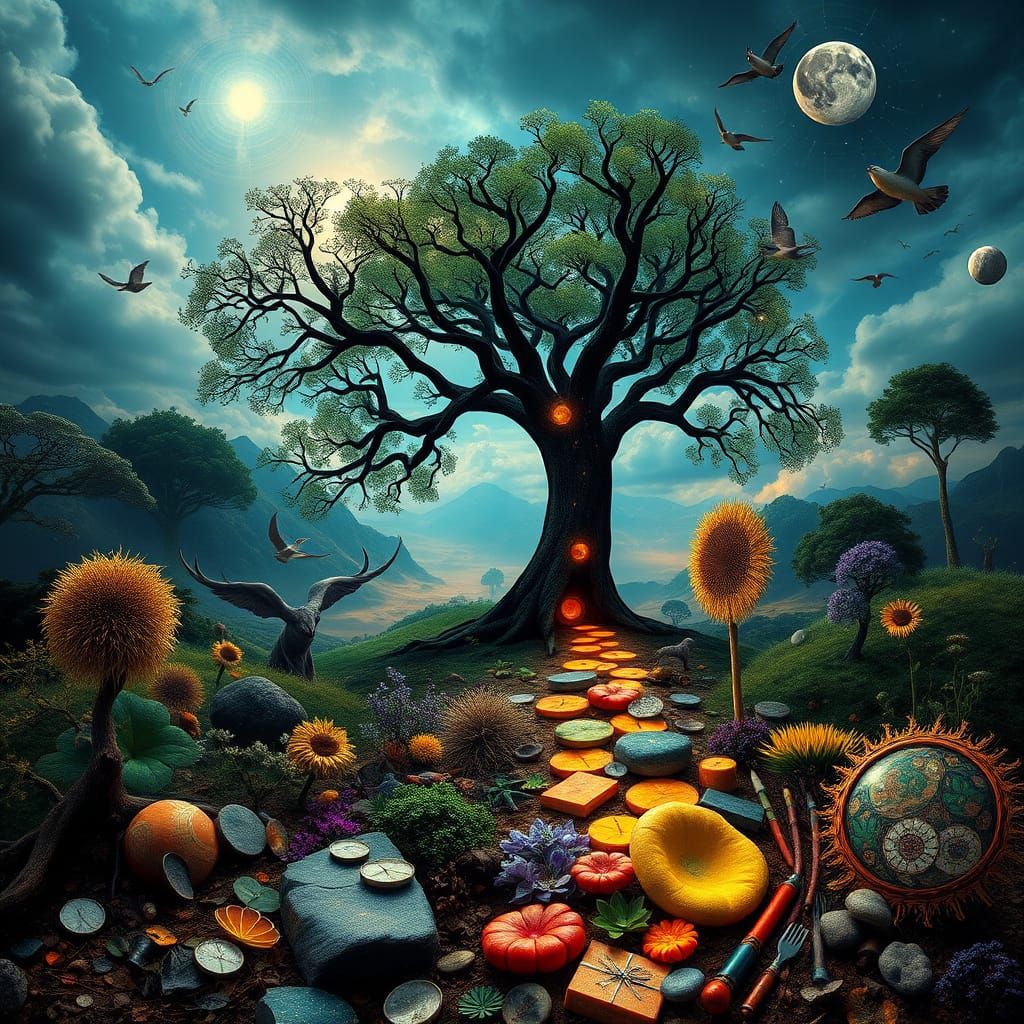 This 8K digital artwork features a mesmerizing collage of glowing elements, blending Bio Art with natural imagery, as a representation of the connection between human and cosmic energies, with a focus on nature and the spirit realm.