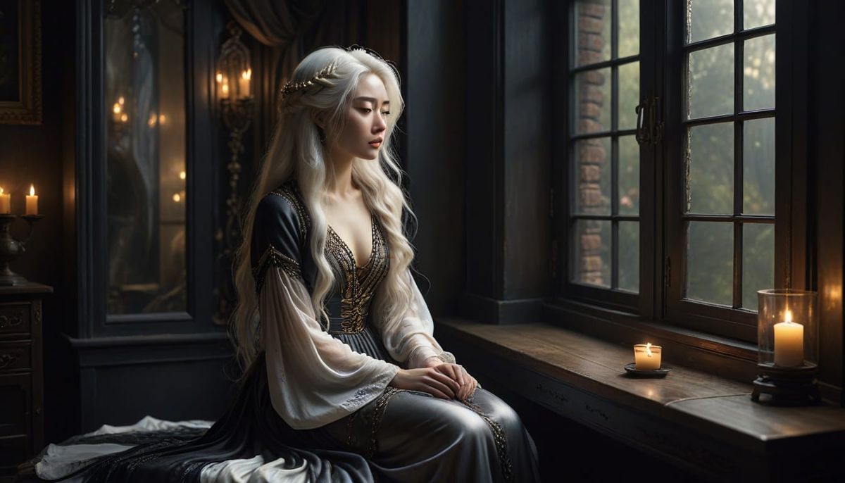 This image shows a sorrowful Chinese woman with long white hair sitting in a candlelit room. The image evokes the artistic style of the Pre-Raphaelite movement with its focus on beauty and detail.