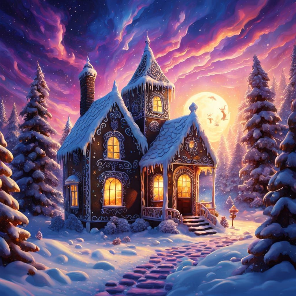 This image shows a surreal contrast between a black hole in space and a detailed gingerbread house in a snowy wonderland. The artwork features vibrant colors and intricate textures, rendered as a fantastical oil painting.