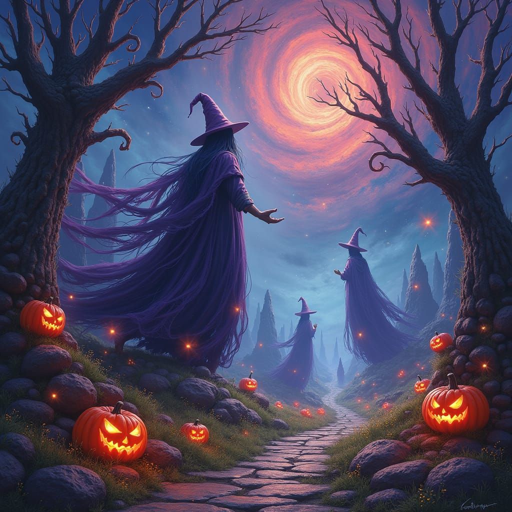A fantastical scene of wizards, goblins, and ghosts in a psychedelic fairy land. The image evokes surreal landscapes with intricate patterns, dark fantasy elements, and an eerie orange-purple glow.