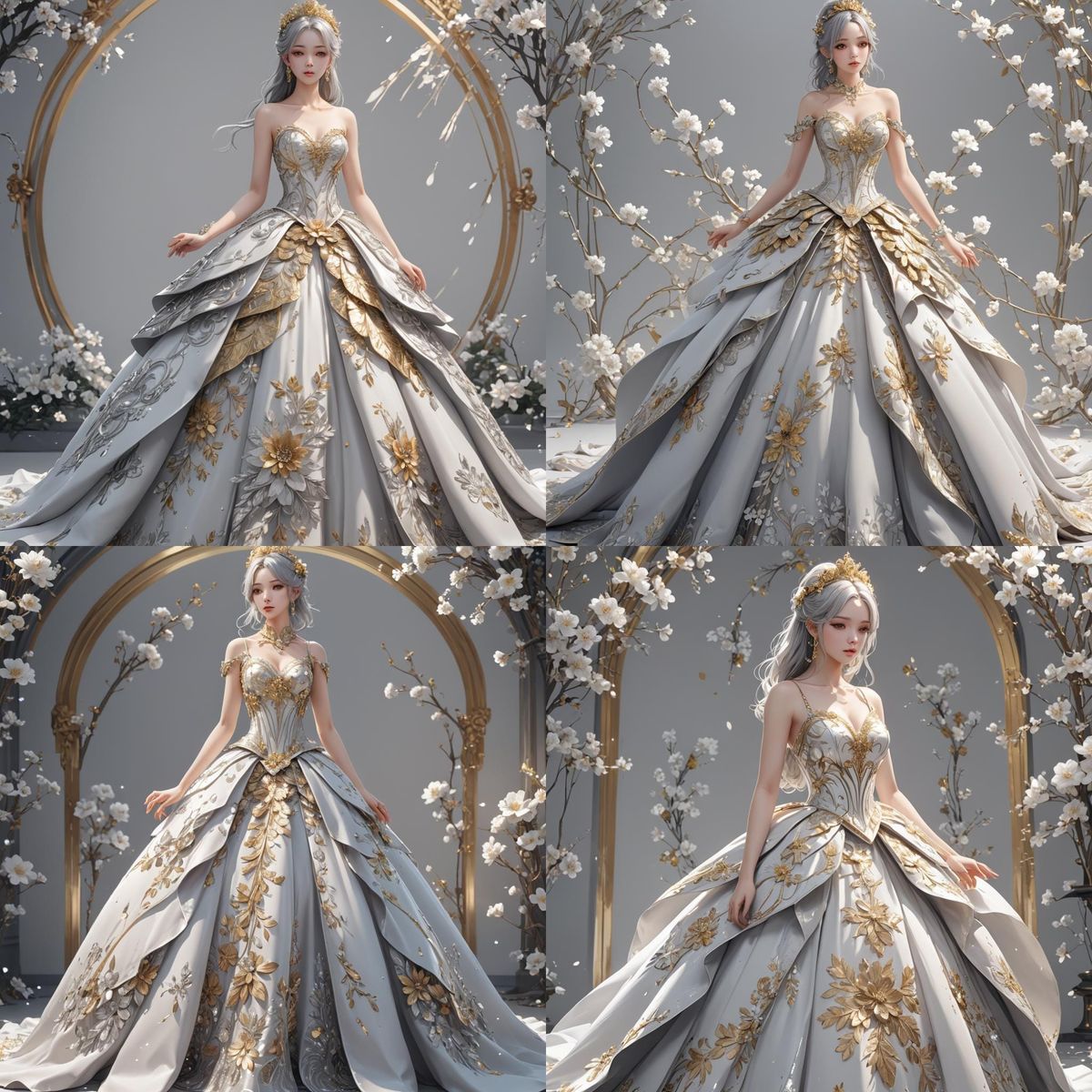 This image shows a stunning white and silver ball gown with gold and floral accents. The sleeveless design is presented as detailed 3D anime art, reminiscent of popular digital styles.