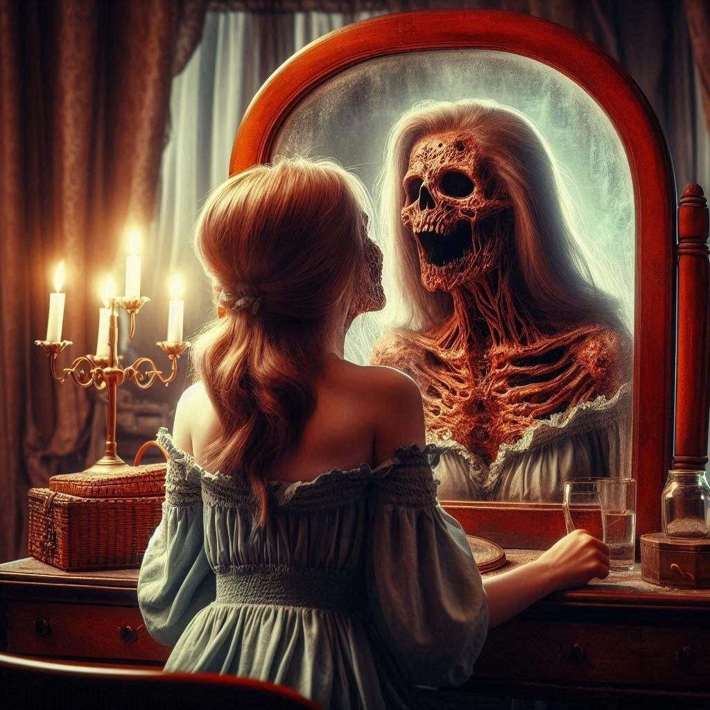 This image shows a horror-style artwork of a woman before a mirror. She is young, but her reflection is aged. The piece features cinematic composition and dark, atmospheric lighting.