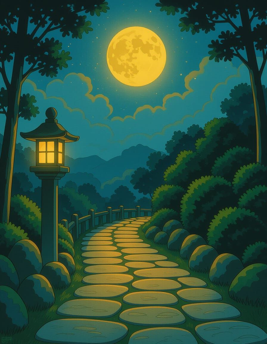 This image shows a tranquil stone path illuminated by lanterns at night. The scene evokes a vintage anime aesthetic with soft moonlight casting dramatic shadows, creating a nostalgic and serene atmosphere.